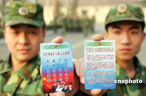 3月9日,部隊官兵正在展示革命軍人核心價值觀“銘記卡”。為加深官兵對當(dāng)代革命軍人核心價值觀的理解掌握,濟南軍區(qū)某部為每名官兵制作了一張小巧精美的當(dāng)代革命軍人核心價值觀“銘記卡”,正面是五個方面的基本內(nèi)容,背面是簡要的基本內(nèi)涵,官兵們可以隨時從衣兜里取出背記。中新社發(fā) 梁志杰 攝