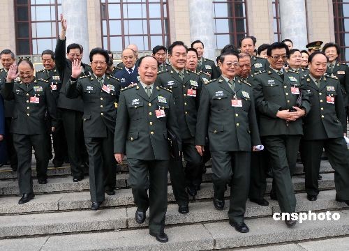 2009年3月12日上午,中國(guó)人民政治協(xié)商會(huì)議第十一屆全國(guó)委員會(huì)第二次會(huì)議圓滿完成各項(xiàng)議程后在人民大會(huì)堂閉幕。圖為軍隊(duì)政協(xié)委員集體走出人民大會(huì)堂。中新社發(fā) 宋健浩 攝