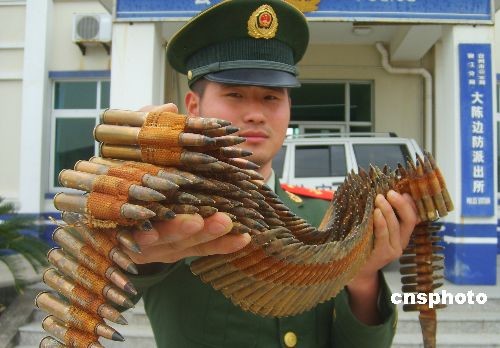 4月27日,臺(tái)州邊防官兵展示收繳的機(jī)槍子彈。4月21日,某施工隊(duì)在浙江省臺(tái)州市大陳島原機(jī)場(chǎng)附近施工時(shí),從地下挖出一個(gè)子彈箱,內(nèi)裝有8成新機(jī)槍子彈250發(fā)。目前,該批子彈已被大陳邊防派出所收繳封存,初步分析為解放戰(zhàn)爭(zhēng)時(shí)期遺留。中新社發(fā) (郟策) 攝