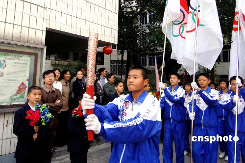 十一月二十二日,一名手持北京奧運會“祥云”火炬的中學生火炬手步入福州第十九中學校園。當日距北京奧運會開幕還有二百六十天,由國際奧委會奧林匹克珍藏品中國巡展組委會主辦的北京奧運會“祥云”火炬進福州校園活動在福州實驗小學、福州第十九中學校園舉行。中新社發(fā) 劉可耕 攝