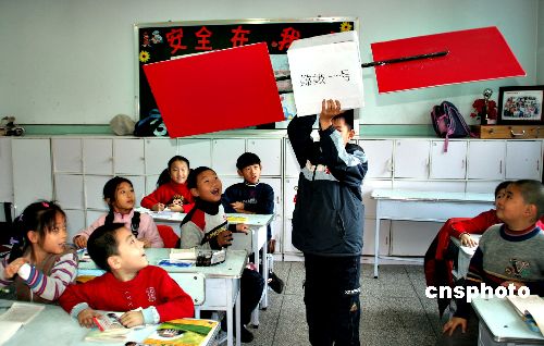 11月27日,哈爾濱市江沿小學(xué)藝術(shù)班的同學(xué)在展示他們制做“嫦娥一號”的模型。中新社發(fā) 姚庭山 攝