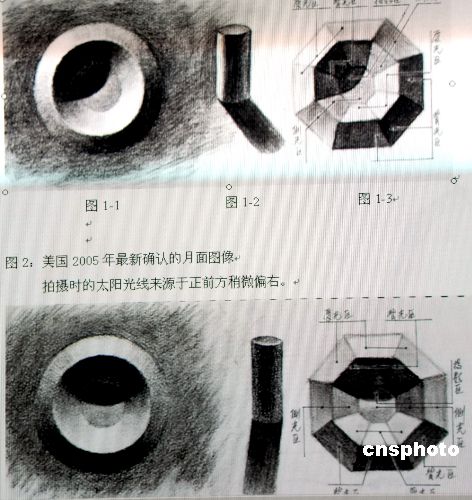| 2007年12月6日,海南在京的一位畫家從光學(xué)角度找到中美兩“月亮”鮮明差別。中國嫦娥首幅月球圖像抄襲美國的傳言,在網(wǎng)上一度鬧得沸沸揚揚,海南省畫家、超常創(chuàng)意專家于廣勝在北京,反復(fù)對照中美兩圖琢磨研究,從光學(xué)角度發(fā)現(xiàn)兩幅圖象有著“更加鮮明的差別”,6日早晨他發(fā)現(xiàn)兩幅圖像是在不同的光源下拍攝的,從另一側(cè)面有力證明了我國嫦娥傳回圖像的真實性。于廣勝說,這一證據(jù)是普通大眾不易發(fā)現(xiàn)的,但通過他所手繪的幾幅圖,即可讓普通大眾一目了然。同時,凡是對光學(xué)有所研究或通曉繪畫用光、攝影和攝像用光的人們,自然明白其理。為了便于廣大讀者理解,他把地球上的環(huán)形山簡化為內(nèi)凹外凸的圓臺(圖1-1、2-1),以顯現(xiàn)不同光線來源下的不同光影效果;由此,又進一步簡化為內(nèi)凹外凸八棱臺(圖1-3、2-3)并標(biāo)注了光線的來源和受光、測光、背光區(qū)域;同時,又畫了一個圓柱體(1-2、2-2)以顯現(xiàn)不同光照角度下的不同投影方向。通過兩組手繪圖,中國與美國公布的兩張圖像在拍攝時,太陽光照射月球角度明顯不同,至少左右相差42度左右。中國拍攝時的太陽光線來源于左前方,而美國拍攝時的太陽光線來源于正前方稍微偏右。于廣勝說,稍有電腦平面制作、攝影和攝像后期制作知識的人們都明白,圖片與圖片的任意組合拼接是輕而易舉的,但要想把圖片中各個圖像所有細(xì)節(jié)的光影全部改變是不可能的,“由此可見,我國嫦娥傳回的圖像其真實性是不容質(zhì)疑了!毕嚓P(guān)鏈接:12月2日,中國探月工程首席科學(xué)家、中國科學(xué)院院士歐陽自遠做客上!拔膮R講堂”,對關(guān)于“嫦娥首幅月球圖像抄襲美國”的傳言作出澄清:“嫦娥傳回的圖像確實是真實的,是經(jīng)過非常復(fù)雜的拍攝、傳輸、接收、處理過程后得到的,并且與美國所拍的圖像有細(xì)微差別”。我國嫦娥一號衛(wèi)星所攝的月面圖像上,某個地方有兩個小坑,而美國2005年最新確認(rèn)的月面圖像上,同樣的地方只有一個小坑。中新社發(fā) 善平 攝