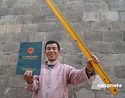 12月8日,程成高在展示他發(fā)明的“帶抹砂漿機(jī)構(gòu)的水平尺”。江西省樂(lè)平市后港鎮(zhèn)程家村農(nóng)民程成高,只有小學(xué)三年級(jí)文化,但他憑借自己的勤奮和智慧,克服困難,用4年的時(shí)間,發(fā)明了集抹砂漿與測(cè)量水平與一身的“帶抹砂漿機(jī)構(gòu)的水平尺”,并獲得了國(guó)家實(shí)用新型專利證書(shū),成為當(dāng)?shù)剞r(nóng)民的典范。另外,他的又一項(xiàng)發(fā)明“滾輪式清掃畚箕”正在申請(qǐng)專利中。中新社發(fā) 石衛(wèi)明 攝