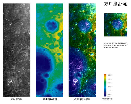 中國(guó)國(guó)家航天局今天向媒體發(fā)布信息說(shuō),“嫦娥一號(hào)”衛(wèi)星CCD相機(jī)已對(duì)月球背面進(jìn)行成像探測(cè),并獲取了月球背面部分區(qū)域的影像圖。此圖顯示的是萬(wàn)戶撞擊坑。萬(wàn)戶撞擊坑位于月球背面南緯9.8度西經(jīng)138.8度區(qū)域,直徑52km,從地球上不能直接看到。