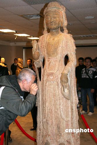 一月四日,一位觀眾在臺(tái)灣中華皇家藝術(shù)博物館近距離欣賞首次展出的該館鎮(zhèn)館之寶——國寶級(jí)文物“大勢(shì)至菩薩”石像。由該館推出的“中華瑰寶系列——宋朝漢白玉十八羅漢特展”當(dāng)日在臺(tái)北開展,造型中西合壁、保存完好,被認(rèn)為是全球唯一保存最完整的“大勢(shì)至菩薩”塑像也同期與觀眾首度見面。據(jù)考證,這尊高一百九十八厘米、石灰石貼金敷彩“大勢(shì)至菩薩”為東魏至北齊年間作品,距今約一千六百年至一千四百年。中新社發(fā) 孫自法 攝