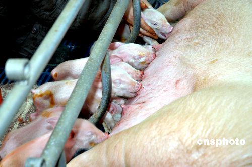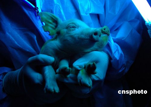 2008年1月7日12時,在哈爾濱三元畜產(chǎn)實業(yè)有限公司,11頭小豬順利降生,其中2頭表現(xiàn)出明顯綠色熒光蛋白特征。當日,東北農(nóng)業(yè)大學傳出喜訊,由該校劉忠華教授主持的中國首例綠色熒光蛋白轉(zhuǎn)基因克隆豬當上“媽媽”,出生的11頭新生小豬其中有6頭為公豬,5頭為母豬,均健康活潑。中新社發(fā) 姚庭山 攝
