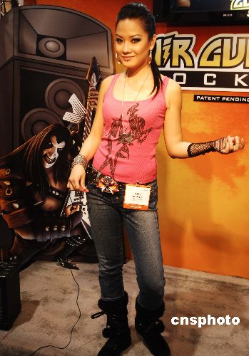 一月九日,一位亞裔樂手在美國拉斯維加斯舉辦的世界最大消費電子產(chǎn)品展上,表現(xiàn)數(shù)字隱形電吉它的奇妙之處,她只需模擬常規(guī)動作就會奏出動聽的電子樂。中新社發(fā) 賈國榮 攝