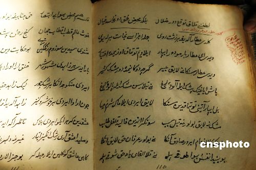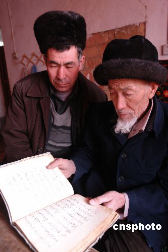 1月13日,吐魯番鄯善縣魯克沁鎮(zhèn)宗教人士在翻閱察合臺(tái)語(yǔ)長(zhǎng)篇敘事詩(shī)《熱吾澤突孜左合熱》手稿。2006年新疆吐魯番地區(qū)少數(shù)民族古籍工作人員,在新疆鄯善縣魯克沁鎮(zhèn)兩位宗教人士手中,先后發(fā)現(xiàn)古西域著名維吾爾族詩(shī)人艾合買提·吾加木尼牙孜在1802年,用察合臺(tái)語(yǔ)(古維吾爾語(yǔ))創(chuàng)作的長(zhǎng)篇敘事詩(shī)《熱吾澤突孜左合熱》(漢譯:左合熱的文明園)手稿,和清代西域維吾爾族學(xué)者吾布勒·伊斯拉木,從波斯語(yǔ)翻譯為察合臺(tái)語(yǔ)(古維吾爾語(yǔ))的抄本《麥魯麻提阿帕克》(漢譯:世界通訊)。這兩本古籍對(duì)研究古西域文學(xué)、歷史、地理和古絲綢之路文明具有重要意義。目前,這兩本古籍已經(jīng)列入國(guó)家珍貴古籍名錄。中新社發(fā) 姜浩 攝