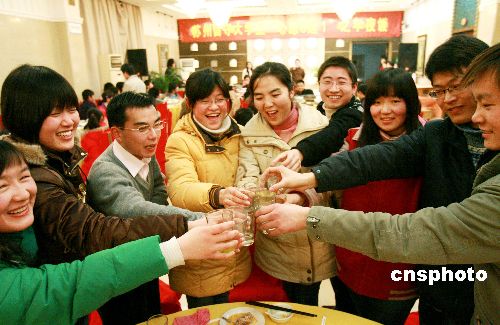 2月2日晚,江蘇蘇州高校百余名留守大學生齊聚東吳飯店,參加寒假“心愿六選一”(即,一張親情電話卡、一頓年夜飯、一次勤工儉學、一次英語培訓、一次心理咨詢和一場免費電影)之年夜飯大聯(lián)歡活動。 中新社發(fā) 蘇秀 攝