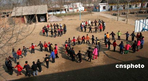 2月22日,啟航學(xué)校的留守學(xué)生手拉手組成奧運(yùn)“五環(huán)”標(biāo)志圖案。當(dāng)日,陜西興平市趙村鎮(zhèn)啟航學(xué)校2008年春季開學(xué),該校240多名留守學(xué)生入學(xué)報到,老師領(lǐng)著學(xué)生們在操場上手拉手組成了奧運(yùn)“五環(huán)”標(biāo)志圖案,表達(dá)留守孩子們對2008年北京奧運(yùn)會的期盼和祝福。中新社發(fā) 何建虎 攝