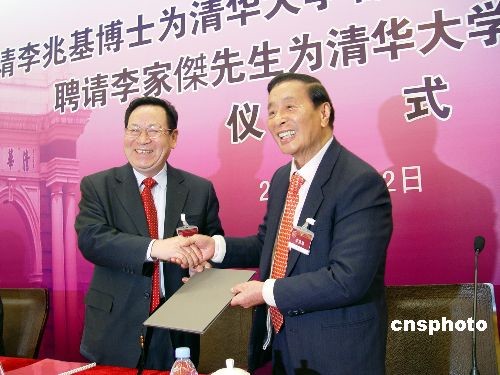 圖為在受聘儀式上,清華大學(xué)校長顧秉林院士(左)親手為李兆基頒發(fā)聘書。