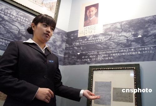4月5日,孫中山秘書、宋慶齡摯友——楊杏佛的七百余件珍貴遺物在上海解密,內(nèi)容涉及民國政治、科技及文學(xué)界秘聞。圖為在上海宋慶齡陵園首次公展的部分楊杏佛珍貴遺物,包括一九二九年,宋慶齡致信楊杏佛,委托其在上海報(bào)章刊登“不再參加國民黨工作”的英語聲明稿及信函原件。中新社發(fā) 潘索菲 攝