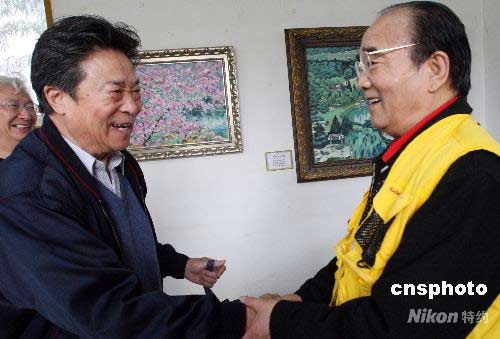 4月15日,以北京植物園景觀為專題的“王石之油畫展”在植物園盆景園內開幕,是次畫展是由曾畫毛澤東巨像的中國著名畫家王石之創(chuàng)作完成,展出的40幅油畫都是以一畫一景的形式從植物園的春天到冬天不同季節(jié),不同區(qū)域的自然風光、園林美景、人文古跡等優(yōu)美景觀。圖為李光曦(左)與高占祥出席開幕式。中新社發(fā) 錢興強 攝