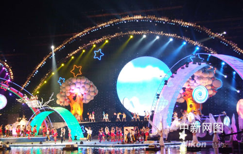 第四屆中國國際動(dòng)漫節(jié)開幕式晚會(huì)現(xiàn)場(chǎng),晚會(huì)由“心”、“情”、“夢(mèng)”三個(gè)篇章組成,充分體現(xiàn)了“多彩動(dòng)漫品質(zhì)生活”的主題。 周翌 攝