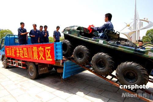 5月18日,由浙江義烏西貝文良特種車輛有限公司,捐贈(zèng)給四川消防總隊(duì)的一輛“西貝虎”新型水陸兩棲全地型功能車,從義烏出發(fā),晝夜兼程趕往四川德陽(yáng),投入抗震救災(zāi)。中新社發(fā) 張建成 攝