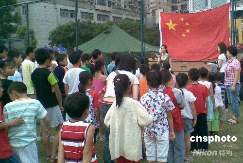 5月19日上午,在成都市青羊區(qū)體育中心安置點(diǎn)設(shè)置的“青羊區(qū)抗震救災(zāi)愛(ài)心家園學(xué)校”開(kāi)學(xué)。該校目前分小學(xué)、初中、高中三個(gè)班,共有80多名學(xué)生。圖為開(kāi)學(xué)時(shí)舉行的升國(guó)旗儀式。中新社發(fā) 魏姝 攝