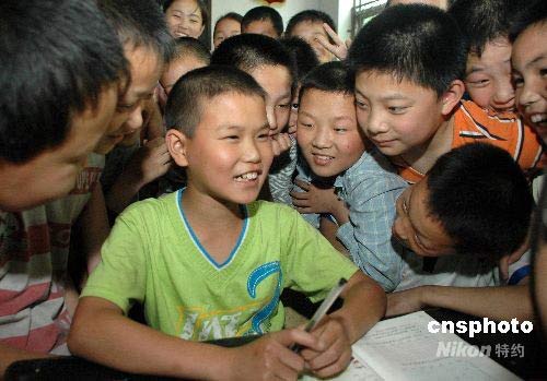 5月25日,來自四川綿陽市火炬實(shí)驗(yàn)小學(xué)學(xué)生藍(lán)宇高興地開始了在河北省新樂市孝德小學(xué)的學(xué)習(xí)生活。地震發(fā)生后,藍(lán)宇來到新樂市赤垢村的姨媽家。經(jīng)聯(lián)系,孝德小學(xué)校領(lǐng)導(dǎo)高度重視,決定收留藍(lán)宇,免除其全部費(fèi)用,并提供藍(lán)宇的生活費(fèi)用。中新社發(fā) 賈敏杰 攝