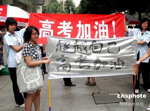 2008年6月7日,福州三中考點,該校高一的學弟學妹們拉起“超越自己,高考加油”的橫幅為參加考試的學長們加油,同時也親身體驗一下高考的緊張氛圍。中新社發(fā) 張 斌 攝
