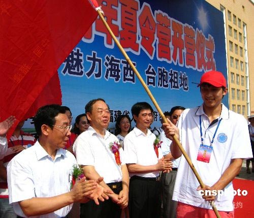 7月3日,海峽西岸2008年臺(tái)胞青年夏令營(yíng)在福州開(kāi)營(yíng),福建省委常委、宣傳部長(zhǎng)唐國(guó)忠(左一)為夏令營(yíng)授旗。作為全國(guó)臺(tái)聯(lián)臺(tái)胞青年千人夏令營(yíng)的福建分營(yíng),本次夏令營(yíng)為期6天,吸引110多名臺(tái)胞青年參加。中新社發(fā) 林維莉 攝