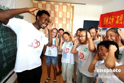 7月10日,揚(yáng)州大學(xué)藝術(shù)學(xué)院的外教羅伯特,正在給地震災(zāi)區(qū)孩子進(jìn)行暑期夏令營(yíng)授課。當(dāng)日,揚(yáng)州大學(xué)藝術(shù)學(xué)院、體育學(xué)院、教育科學(xué)學(xué)院以及外國(guó)語(yǔ)學(xué)院的20余名師生,為來(lái)自四川地震災(zāi)區(qū)的67名學(xué)生舉辦“真情傳遞、愛(ài)心永恒”素質(zhì)拓展夏令營(yíng)活動(dòng),幫助他們開(kāi)闊視野、豐富知識(shí)、拓展素質(zhì)。中新社發(fā) 顧亮亮 攝