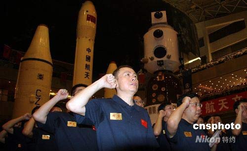 7月19日,伴隨著《飛得更高》的激揚(yáng)樂曲,用于發(fā)射“神舟”七號(hào)載人飛船的——“長征二號(hào)F”運(yùn)載火箭在中國運(yùn)載火箭技術(shù)研究院舉行出征儀式。經(jīng)過奮力拼搏,“神七”運(yùn)載火箭“長征二號(hào)F”已總裝完畢、整裝待發(fā),即將奔赴中國酒泉衛(wèi)星發(fā)射中心,執(zhí)行“神舟”七號(hào)載人航天飛行任務(wù)。圖為“長征二號(hào)F”運(yùn)載火箭總指揮劉宇(前左一)、總設(shè)計(jì)師荊木春(前左二)和火箭發(fā)射隊(duì)隊(duì)員一起宣誓出征。中新社發(fā) 孫自法 攝