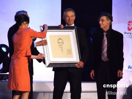 8月4日,由北京大學(xué)主辦的“2008奧運.冠軍論壇”在北京大學(xué)百年紀(jì)念講堂內(nèi)隆重開幕。出席開幕盛典的貴賓有英國前首相托尼.布萊爾、成龍、譚盾、揚揚、羅雪娟在內(nèi)的數(shù)十位中外嘉賓。圖為北京大學(xué)校長許智宏向英國前首相托尼.布萊爾贈送畫像。中新社發(fā) 鄭雄增 攝