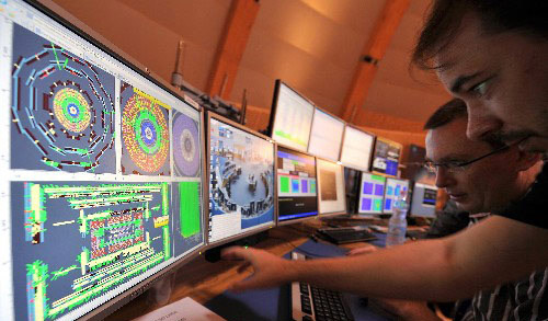歐洲核子研究中心的科學(xué)家在瑞士日內(nèi)瓦附近的大型強子對撞機控制中心忙碌。