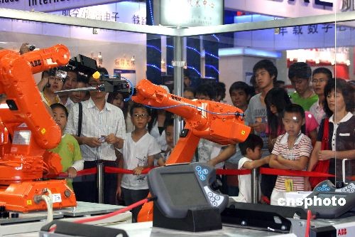 第十屆中國國際高新技術(shù)成果交易會10月12日在深圳正式開館迎客。在上屆首次設(shè)立機器人展備受追捧的基礎(chǔ)上,本屆高交會機器人專展在展出規(guī)模和層次上又有提高,以工業(yè)機器人、民生機器人、特種機器人、青少年機器人等多部分展示來自兩岸三地,以及日本等國的中外著名大學、研究機構(gòu)、高科技企業(yè)在該領(lǐng)域的成果。圖為兩臺六軸機器人在乒乓球上表演寫字“手藝”,吸引著觀眾。中新社發(fā) 凌風 攝