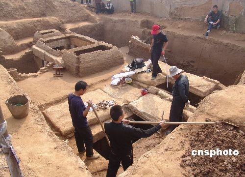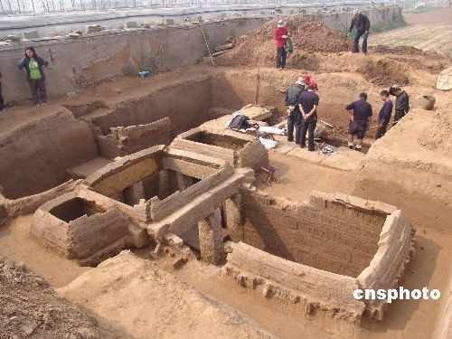 10月15日,考古人員正在挖掘漢墓。近日,在山東省沂南縣磚埠鎮(zhèn)發(fā)現(xiàn)占地約3000平方米的東漢家族墓葬群,經(jīng)過(guò)上級(jí)部門(mén)批準(zhǔn),考古人員對(duì)其中兩座墓穴進(jìn)行了搶救性科學(xué)挖掘,目前已經(jīng)發(fā)掘出土8件釉陶壺在內(nèi)的大量文物,墓內(nèi)石壁上有多幅畫(huà)像,清晰可見(jiàn)。中新社發(fā) 杜昱葆 攝