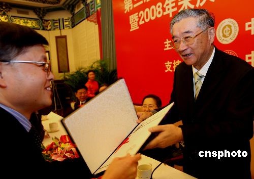 圖為中國(guó)宋慶齡基金會(huì)主席胡啟立(右)為“宋慶齡兒科醫(yī)學(xué)獎(jiǎng)”獲獎(jiǎng)?wù)哳C發(fā)獲獎(jiǎng)證書(shū)。