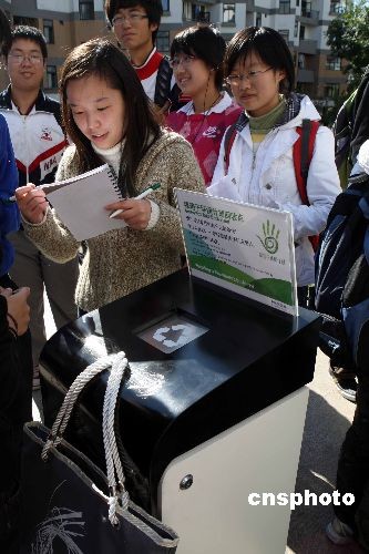 10月31日晚,由某環(huán)保企業(yè)率先發(fā)起的環(huán)!熬G箱子”進(jìn)校園活動(dòng)在中國(guó)傳媒大學(xué)、清華大學(xué)正式展開(kāi),此次活動(dòng)的目的在于喚起全民族的環(huán)保意識(shí),讓每一位公民都為環(huán)保事業(yè)做力所能及的事情。中新社發(fā) 任海霞 攝