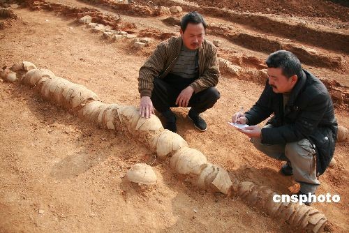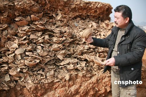 2008年12月20日,歙縣北宋龍窯遺址發(fā)掘現(xiàn)場。近日,安徽歙縣桂林鎮(zhèn)發(fā)現(xiàn)一處北宋龍窯遺址,面積達3700多平方米,出土了大量精美青瓷珍貴文物。經(jīng)安徽省考古專家勘察鑒定為北宋時的龍窯,主要生產(chǎn)陶器和青瓷,專家分析至少有上千件珍稀文物。該處北宋龍窯遺址于2008年9月開挖績黃高速公路3標(biāo)段連接線時發(fā)現(xiàn)。中新社發(fā) 方也廣德 攝