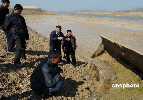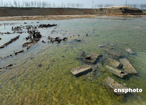 2009年3月25日,在京杭運(yùn)河山東臺(tái)兒莊段拍攝到的浮出水面的明朝古運(yùn)河船閘閘址。近日,一座在水下沉睡了400多年的古水工建筑遺址(古船閘)在京杭運(yùn)河臺(tái)兒莊段進(jìn)行河道疏浚工程時(shí)被發(fā)現(xiàn),這座古船閘位于新閘村北古運(yùn)河中心,船閘東西長(zhǎng)約56米,南北約12米,古船閘的木樁繁多,條狀塊石可見(jiàn),閘門(mén)樁基遺址清晰,據(jù)考證船閘修建于明朝萬(wàn)歷年間,是明代泇運(yùn)河上的丁廟船閘,是棗莊段運(yùn)河(泇運(yùn)河)的八閘之一,距今400多年。此次古船閘的發(fā)現(xiàn),是繼頓莊船閘后的又一重大發(fā)現(xiàn),對(duì)古運(yùn)河棗莊段歷史和古水工建筑的研究具有非常重要的價(jià)值。中新社發(fā) 高啟民 攝