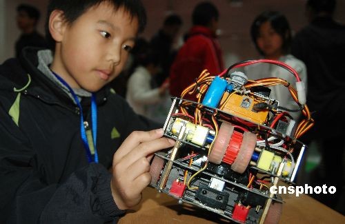 2009年3月29日,2009年“VEX”杯蘇州市青少年機(jī)器人比賽在蘇州善耕實(shí)驗(yàn)小學(xué)開幕,來自蘇州敬文實(shí)驗(yàn)小學(xué)及其周邊縣市的77所中小學(xué)校的467位選手參賽,參賽者分別進(jìn)行了機(jī)器人“踢足球”、“滅火”和“基本技能”等八個(gè)項(xiàng)目的角逐,場(chǎng)面十分熱鬧。中新社發(fā) 蘇民 攝