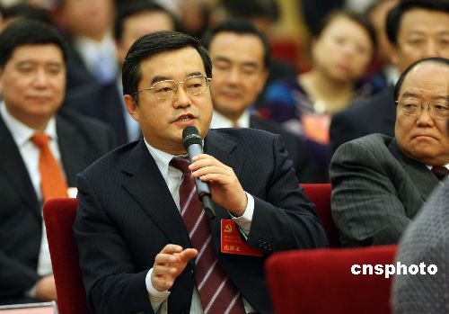 十月十六日,出席中國(guó)共產(chǎn)黨第十七次全國(guó)代表大會(huì)的中央國(guó)家機(jī)關(guān)代表團(tuán)在北京人民大會(huì)堂對(duì)十七大報(bào)告進(jìn)行開放式討論,國(guó)防科工委主任張慶偉在會(huì)上就“嫦娥一號(hào)”探月工程問題回答記者提問。中新社發(fā) 毛建軍 攝