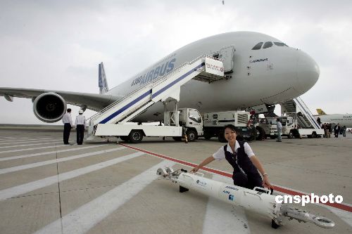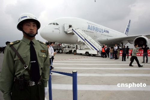 十月二十五日,空中客車A380飛機(jī)在上海浦東國際機(jī)場展示,據(jù)悉,這架生產(chǎn)序列號為007的A380是首度在上海公開其豪華客艙內(nèi)飾?湛凸ぷ魅藛T在此間表示,A380目前獲得十六家客戶的一百八十九架確認(rèn)及承諾訂單,○八年將交付十三架,○九年交付二十五架,到二○一○年,將年產(chǎn)四十架,而中國南方航空訂購的五架A380計劃在○九年下半年交付。中新社發(fā) 潘索菲 攝