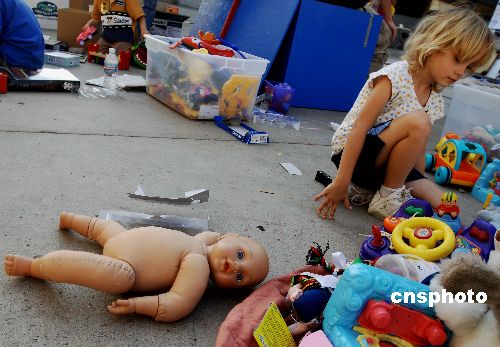 圖為一位小災民在圣地牙哥高通體育館臨時避難場設立的兒童樂園里。