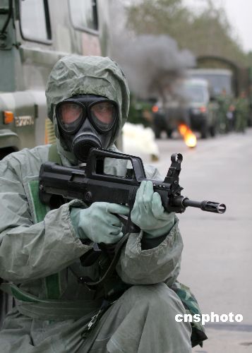 10月27日,“鐵拳-2007”實(shí)兵檢驗(yàn)性演習(xí)拉開(kāi)帷幕。10月28日,鐵拳2007機(jī)步師實(shí)兵檢驗(yàn)性演習(xí)部隊(duì)在機(jī)動(dòng)途中展開(kāi)防持久毒劑襲擊,化學(xué)偵察,道路消毒,裝備消毒,人員消毒等科目演練。中新社發(fā) 曾憲平 攝