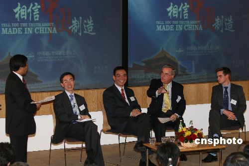 圖為英國諾丁漢大學(xué)教授姚樹潔 、中國駐英使館政治參贊劉為民、北京大學(xué)中國經(jīng)濟(jì)研究中心主任林毅夫、英中貿(mào)易協(xié)會(huì)主席白樂威和英國諾丁漢大學(xué)講師薩瑟蘭(自左至右)就“中國制造”的話題進(jìn)行討論。