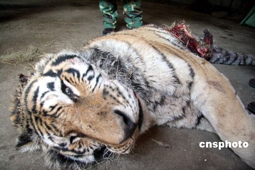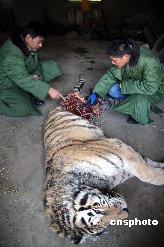 2007年11月18日,沈陽冰川動物園東北虎之間發(fā)生近年來罕見的自相殘殺現(xiàn)象,三只成年東北虎咬死另一只成年東北虎,專家分析原因很可能是入冬以來動物供給不足造成。中新社發(fā) 趙敬東 攝