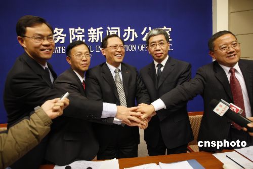 11月26日下午,繞月探測工程領(lǐng)導(dǎo)小組副組長、國防科工委副主任、航天局局長孫來燕(中),繞月探測工程測控系統(tǒng)副總指揮、北京航天飛行控制中心主任朱民才(左二),繞月探測工程副總指揮、航天科技集團(tuán)公司副總經(jīng)理雷凡培(右二),中國科學(xué)院空間科學(xué)與應(yīng)用中心主任吳季(右)以及國新辦新聞局副局長華清(左),在國務(wù)院新聞辦公室舉行的新聞發(fā)布會(huì)上,共同慶祝中國首次月球探測工程的圓滿成功。當(dāng)日,國務(wù)院新聞辦公室邀請中國繞月探測工程領(lǐng)導(dǎo)小組副組長、國防科工委副主任、國家航天局局長孫來燕等介紹中國首次月球探測工程等方面情況,并答記者問。中新社發(fā) 杜洋 攝