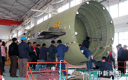 中國(guó)首架自主知識(shí)產(chǎn)權(quán)的噴氣支線客機(jī)ARJ21總裝前中后機(jī)身上下對(duì)合。
