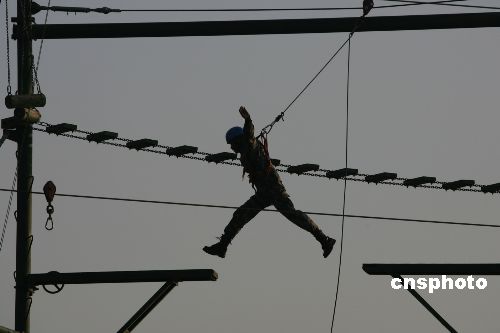 圖為中國士兵飛越斷橋。
