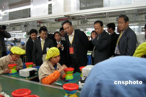 中國國務(wù)院新聞辦副主任王國慶為首的國務(wù)院驗(yàn)收檢查組十二月二十五日至二十六日在廣州、河源等地,采取聽取匯報(bào)、現(xiàn)場(chǎng)隨機(jī)抽查等方式對(duì)廣東省四個(gè)月來的產(chǎn)品質(zhì)量和食品安全專項(xiàng)整治進(jìn)行檢查驗(yàn)收。圖為驗(yàn)收組在河源一玩具廠進(jìn)行檢查。中新社發(fā) 唐貴江 攝