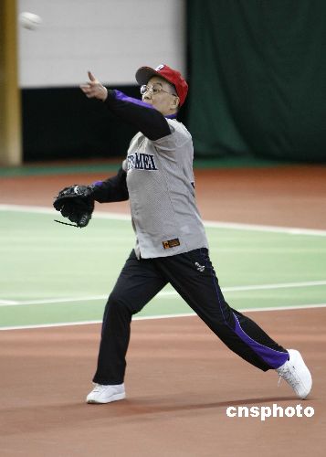 十二月二十九日,中國國務(wù)院總理溫家寶在北京釣魚臺國賓館內(nèi)的網(wǎng)球館與日本首相福田康夫共同練習(xí)棒球投球。中新社發(fā) 盛佳鵬 攝