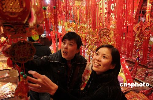 十二月三十一日,為了迎接新年,福建泉州購買喜慶用品的市民絡(luò)繹不絕,市場熱鬧非凡。“爆竹”掛件、彩燈、“中國結(jié)”等的銷售異;鸨,家家戶戶都將自家里里外外裝點一新迎接新年。中新社發(fā) 傅丹丹 攝