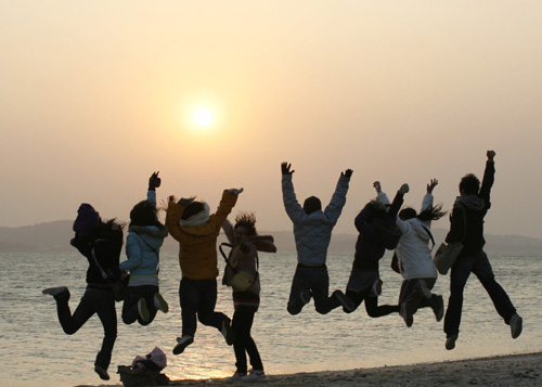 臺灣地區(qū)2007年最后一道夕陽,十二月三十一日出現(xiàn)在金門,古寧頭慈堤外,青年追日族興奮揮別落霞,準(zhǔn)備迎接新一年到來。(“中央社”圖;倪國炎攝)