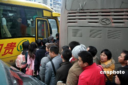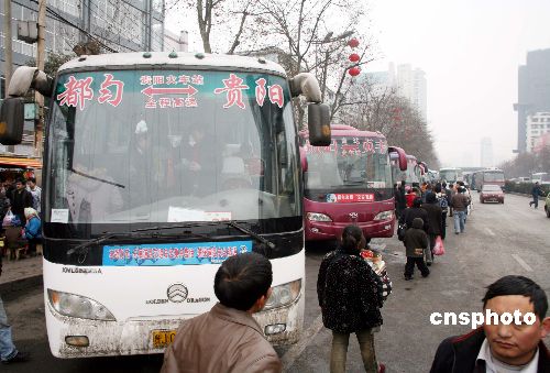 1月31日,在貴陽市遵義路,旅客們登上貴陽至都勻、凱里的長途客車。據(jù)貴陽交通部門信息,當(dāng)天貴遵路、貴新路等多條高速公路已經(jīng)開通運(yùn)營。 中新社發(fā) pengnian 攝