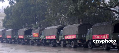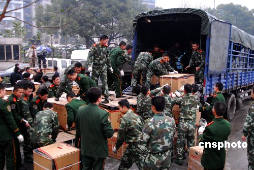 2月4日,雪凝天氣尚未結(jié)束,貴陽地區(qū)又飄起了毛毛細(xì)雨,在省政府廣場(chǎng)上,武警戰(zhàn)士在裝運(yùn)重慶等省市支援貴州的救災(zāi)物資和小型發(fā)電機(jī),準(zhǔn)備運(yùn)往此次雪災(zāi)中受災(zāi)嚴(yán)重的黔東南、黔南、銅仁、畢節(jié)等地區(qū)。此次持續(xù)20多天的雪凝凌凍天氣,使貴州省70多個(gè)縣市受災(zāi)嚴(yán)重,部分縣市停水?dāng)嚯娨呀?0天。中新社發(fā) 歐陽昌佩 攝