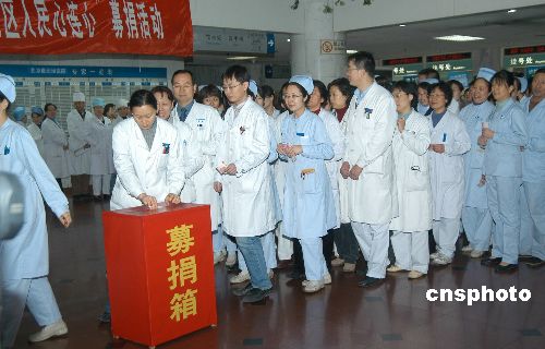 二月五日,北京世紀(jì)壇醫(yī)院職工排隊(duì)為受災(zāi)的南方省、市衛(wèi)生廳、局捐款。北京衛(wèi)生局四日向全市衛(wèi)生系統(tǒng)發(fā)出緊急通知,號召廣大醫(yī)務(wù)人員向冰雪災(zāi)區(qū)緊急捐款。據(jù)不完全統(tǒng)計(jì),截止五日,已累計(jì)捐款四百一十八萬八千元人民幣。這是北京衛(wèi)生系統(tǒng)近年來在捐款活動(dòng)中,時(shí)間最短、數(shù)量最多的一次。中新社發(fā) 曾利明 攝